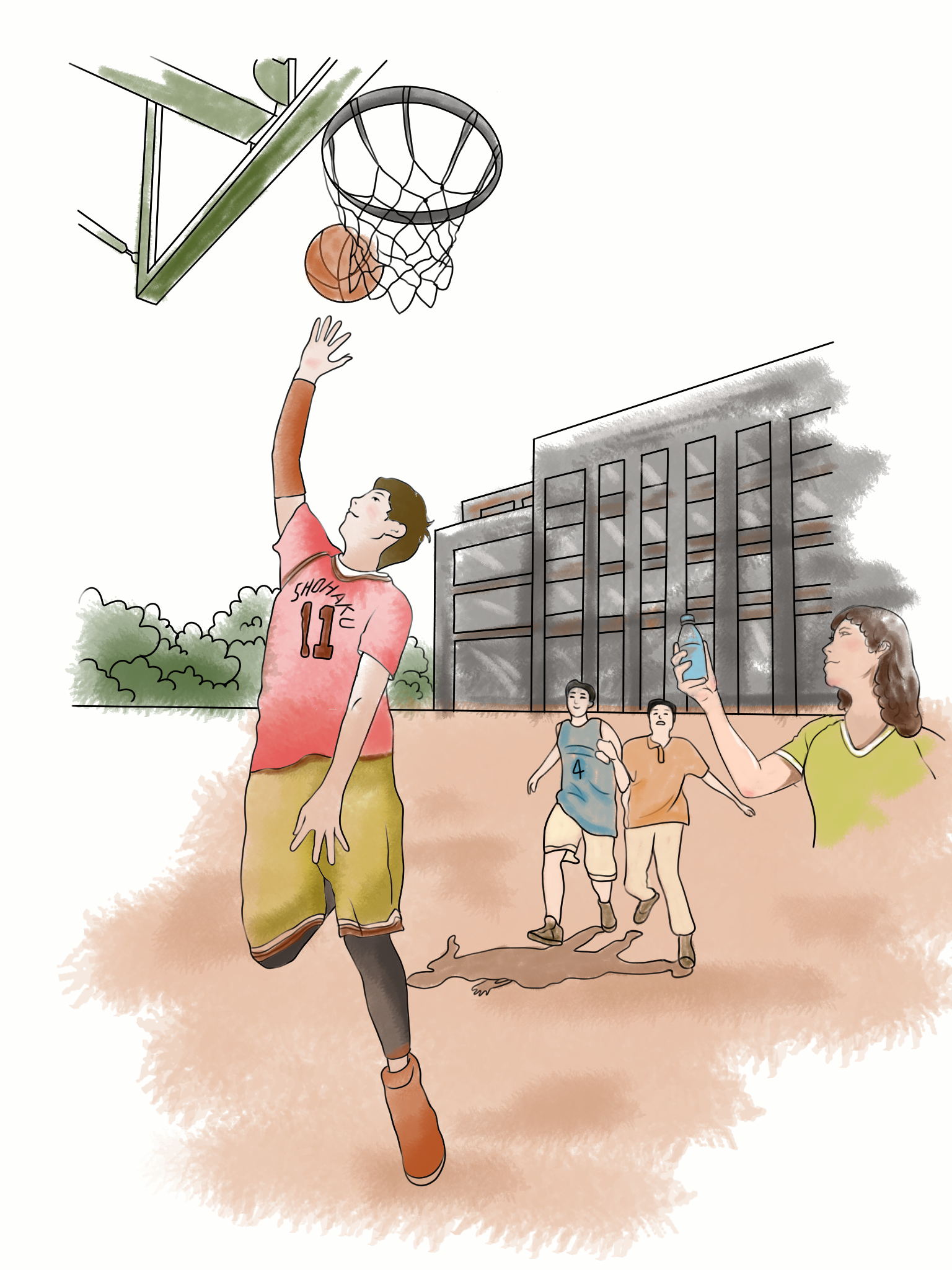 大家望着篮球,在球场上徘徊,有种“黔驴技穷”的感觉,没有了原先的热度,就在大家有想放弃的信念时,我灵机一动,忽然眼前一亮,想起了刚才两球相撞的一幕。我投篮很准,拿过球,用尽全身力气对准球射了过去,“砰”的一声,两球相撞,篮球脱离了束缚,掉落下来,大家鼓掌欢呼,我也露出开心的笑容。